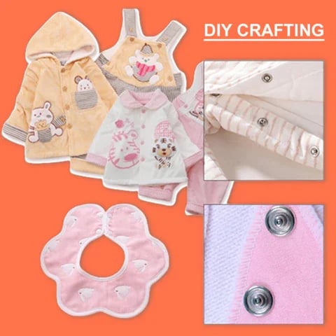 - Widely Applicable:This snap-button tool kit is enough to meet your different needs in DIY crafts or making thin clothes. It can be applied to baby bibs crawling clothes hats shirts baby jumpsuits saliva towels barbie/doll clothes pet clothes or other places you need it.